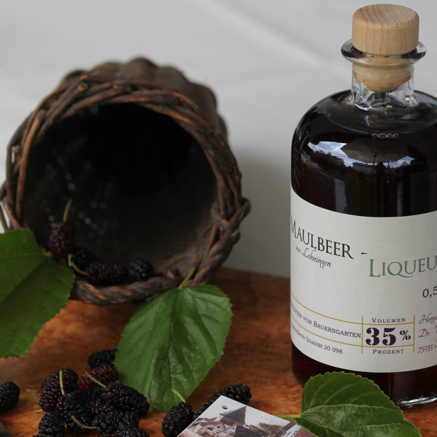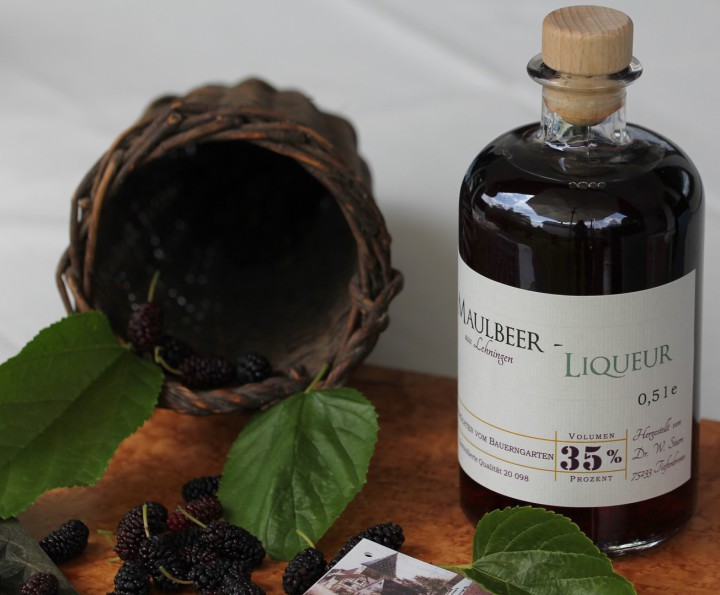 Die großen tief-schwarzen Früchte schmecken kräftig, sind sehr süß und sind hoch-aromatisch. Die Beeren reifen nur nach und nach, sodass die Ernte nicht zeitgleich möglich ist. Die begehrten Früchte können deshalb nur handverlesen geerntet werden. Vor Jahren habe ich in unserem Bauerngarten Maulbeerbäume gepflanzt. Der nach Rosenaroma schmeckende dunkelrote Saft aus den eigenen fruchtigen reifen schwarzen Maulbeeren ist die wesentliche Grundlage für meinen nicht alltäglichen Likör. Durch die dosierte Zugabe von Kandis, verschiedenen Botanicals und Gewürzen der Seidenstraße erhält der Liqueur seine Harmonie. Beim Genießen ist ein leicht honigartiger Geschmack zu vermuten. Bei dieser Köstlichkeit handelt es sich um eine absolute Rarität, die Individualität erkennen läßt. Deshalb verfüge ich auch nur über eine kleine Menge des einzigartigen Liqueurs aus den hauseigenen schwarzen Maulbeeren..